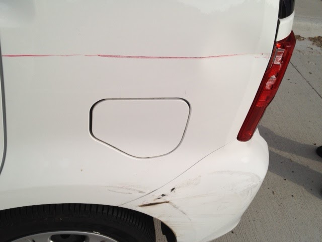 I’ve had my wonderful, beautiful new car for about a year now, and for that year I’ve had no bumps, scratches, dents, or chips in the paint. Yesterday all of that changed. My poor car was attacked by a snappy looking red Camaro convertible. Here’s the damage: